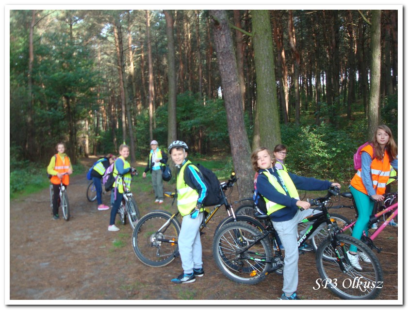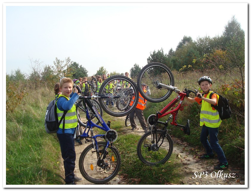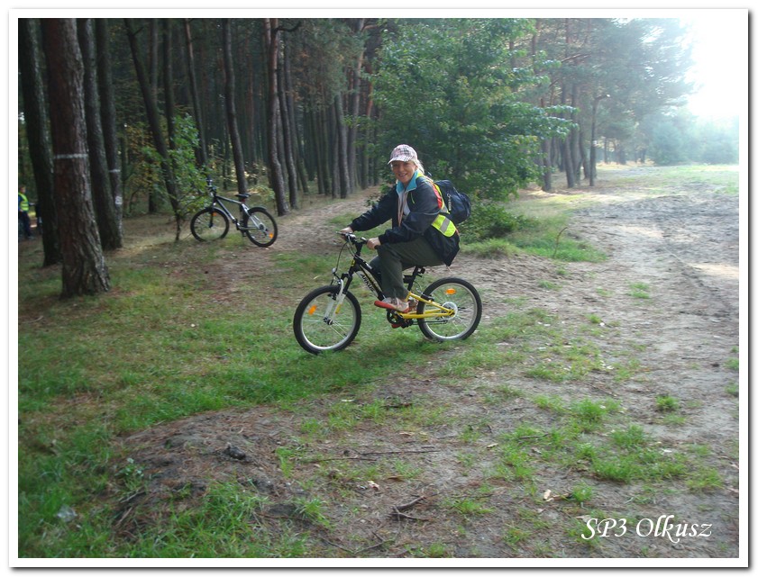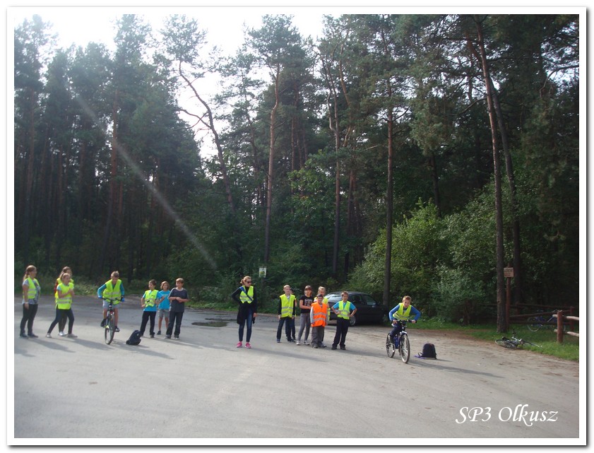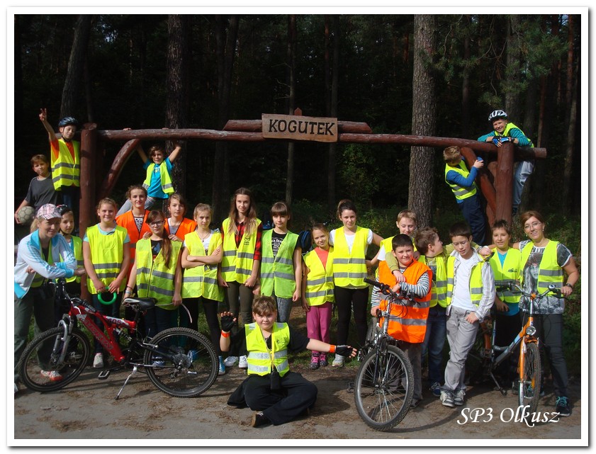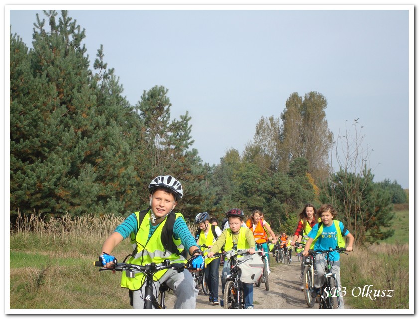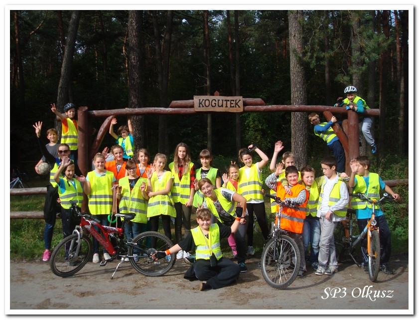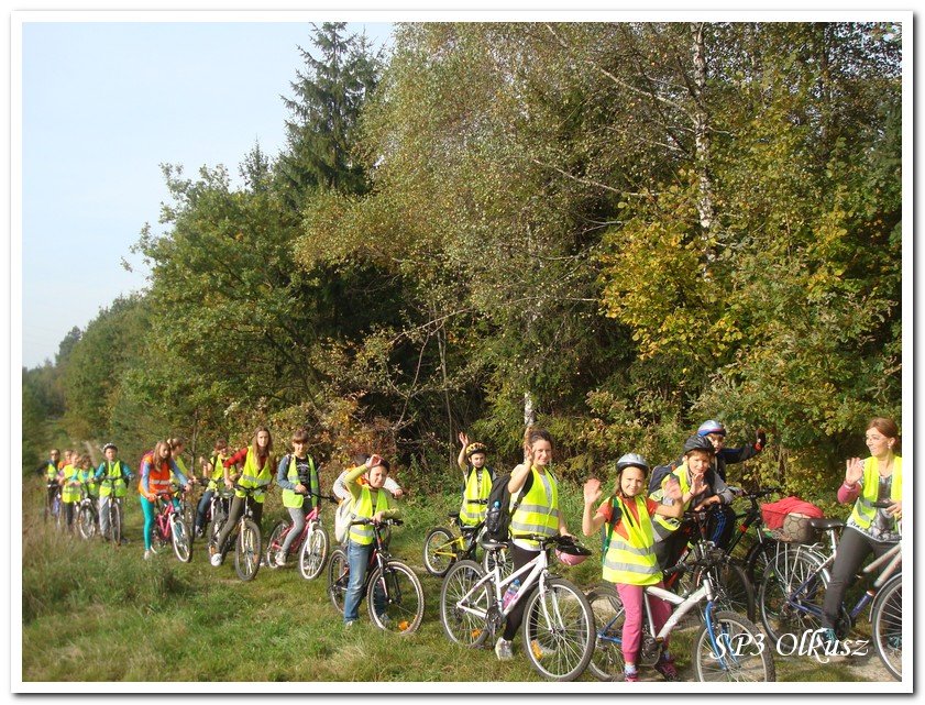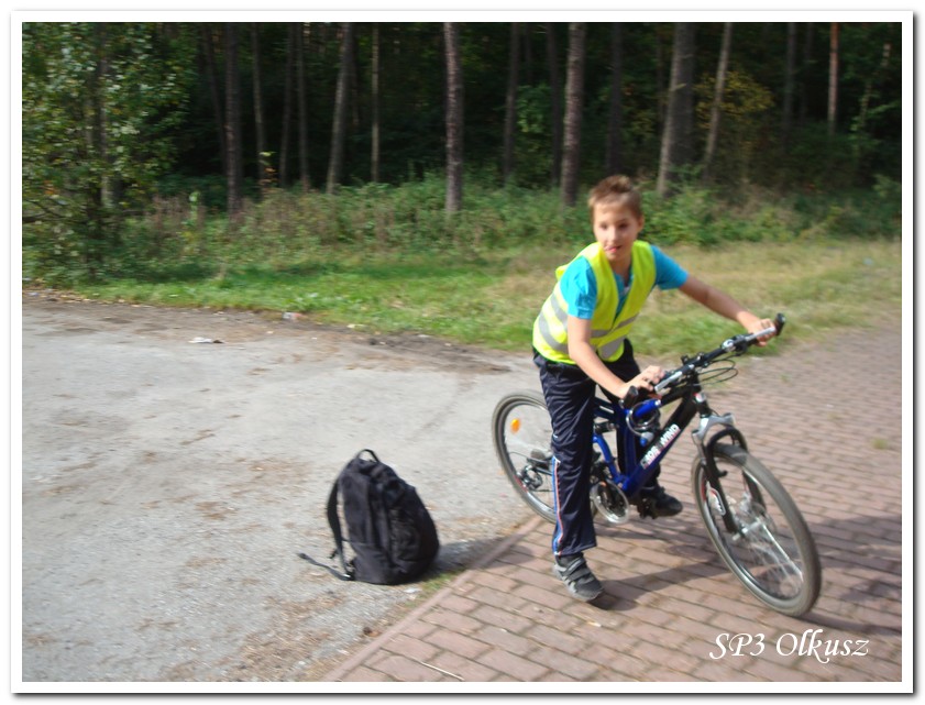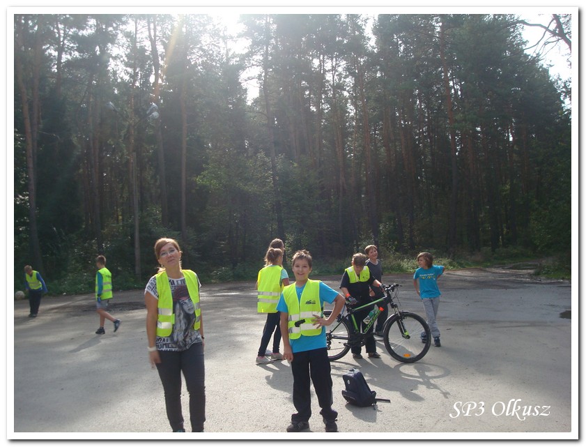 Mimo, że blisko to ciekawie, bo nikt nigdy nie był, nie widział albo był dawno i nie pamięta, a z grupą w sumie przyjemniej niż w mniejszym gronie. Pogoda przepiękna, leśne dróżki w miarę proste, a las jak ze snu. Wymarzona trasa na niedzielne przejażdżki, na które niestety brakuje czasu. Niektóre osoby chcą jechać szybko, ktoś inny zbyt wolno i trzeba czekać. Malownicze widoki lasów mieszanych koją spocone ciała, dają wytchnienie, ale tylko na chwilę. Dalej trzeba jechać. Nikt się nie złości jeśli trzeba zwolnić, zatrzymać się, poczekać. Grupa jest zgrana i odpowiedzialna. Wszyscy mają jeden cel: dojechać szczęśliwie i wrócić. I znów pod górkę, i dalej polaną. Ktoś schodzi z roweru, ktoś inny próbuje swych sił. I dalej przed siebie. Trzeba się poświęcić, a widoki rekompensują każdy wysiłek. Teraz znów równo, polną drogą, na szczęście nie pod górkę, trochę kamieni, piasek utrudnia przejazd, ale solidarnie razem. Ktoś zwolnił... - To ja dotrzymam mu kroku! – Poczekajmy! – słyszały często opiekunki z ust uczestników. Niewątpliwie lekcje wychowawcze o tolerancji, pomaganiu słabszym, nie wyśmiewaniu się, gdy coś komuś nie wychodzi, najwyraźniej przynoszą widoczne efekty w olkuskiej szkole. W tym czasie chwilka dla ducha i ciała na cudnej leśnej polanie. I znowu w drogę. I dalej niestrudzeni rajdowcy pokonywali trasę w kierunku Kogutka. A tam miejsce leśne jak zaczarowane zaprasza na zacienione ławki aby odpocząć. Urokliwe stare drzewa i cudowne liście jesienne pod nimi. Po regeneracyjnym dostarczeniu płynów spragnionym organizmom, dzieci jeszcze relaksowały się w czasie zabaw rekreacyjnych. Gra w piłkę, pokonywanie w sztafecie wyścigu rowerowego w slalomie, w który włączyły się opiekunki, skakanie na skakankach, frisbee na tle przyrody dostarczyły niezwykłych wrażeń i z pewnością zbliżyły do siebie dzieci. Dobra zabawa, salwy śmiechu, piękne widoki – to najczęstsze słowa, które pojawiały się na ustach uczestników Odblaskowego Rajdu Rowerowego, który dzieci nazwały Rajdem „Oskarowym" ze względu na wydarzenia mu towarzyszące. Trasa powrotna prowadziła ponownie przez Zimnodół, gdyż wspaniała Rodzina Państwa Sygułów zaprosiła wszystkich uczestników rajdu na pieczenie kiełbasek oraz niebywale przepyszne łakocie w postaci wspaniałych wypieków, którymi zarówno dzieci jak i ich opiekunki były zachwycone. Udostępniono toalety w domu, taras i miejsce na łące. Wdzięczności wręcz nie można było wyrazić słowami, bo jeśli wszystkie słowa nie są w stanie wyrazić wdzięczności, jest jedno, krótkie, skromne: DZIĘKUJEMY!!! W doskonałych humorach, z pełnymi brzuszkami i w świetnej kondycji uczestnicy wyjazdu musieli wracać. Zapowiedzieli jednak swoim opiekunkom, że to nie ostatnia ich wyprawa rowerowa!