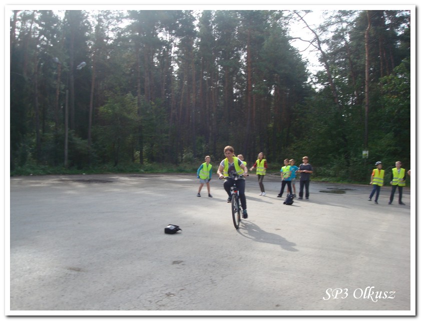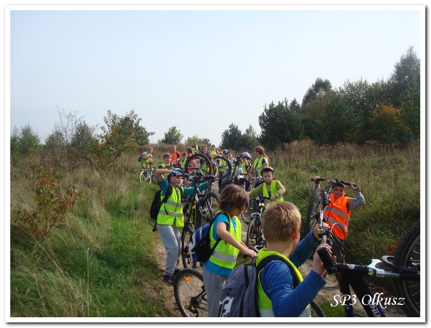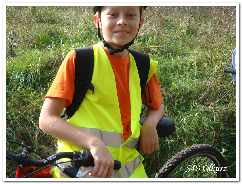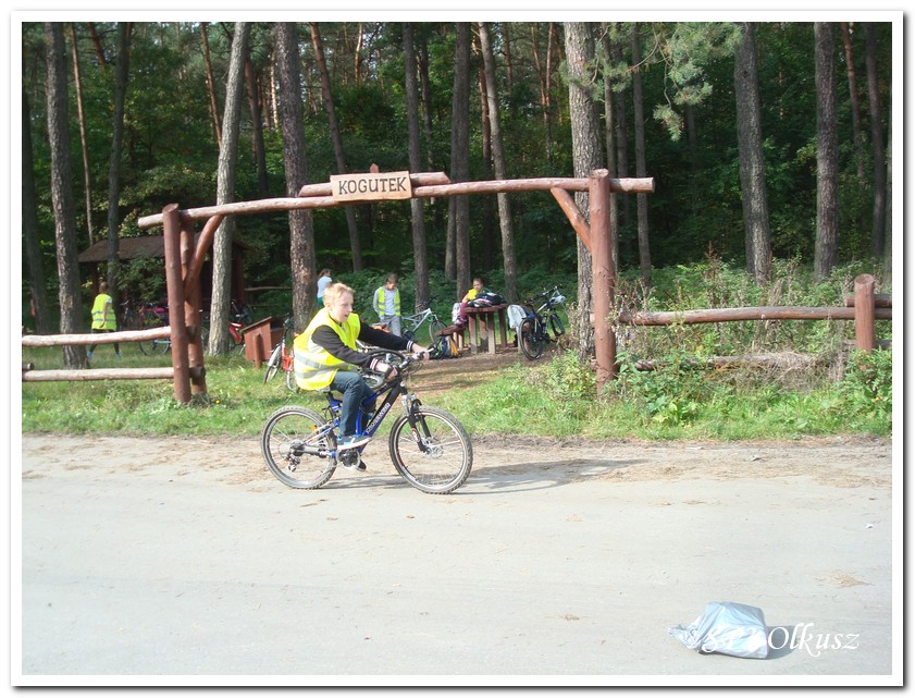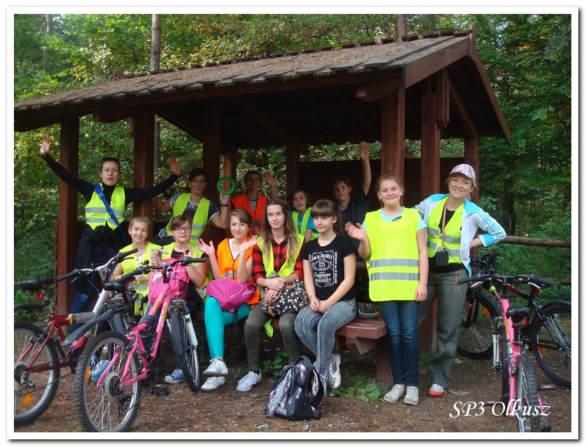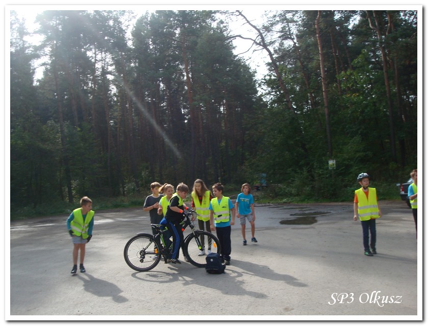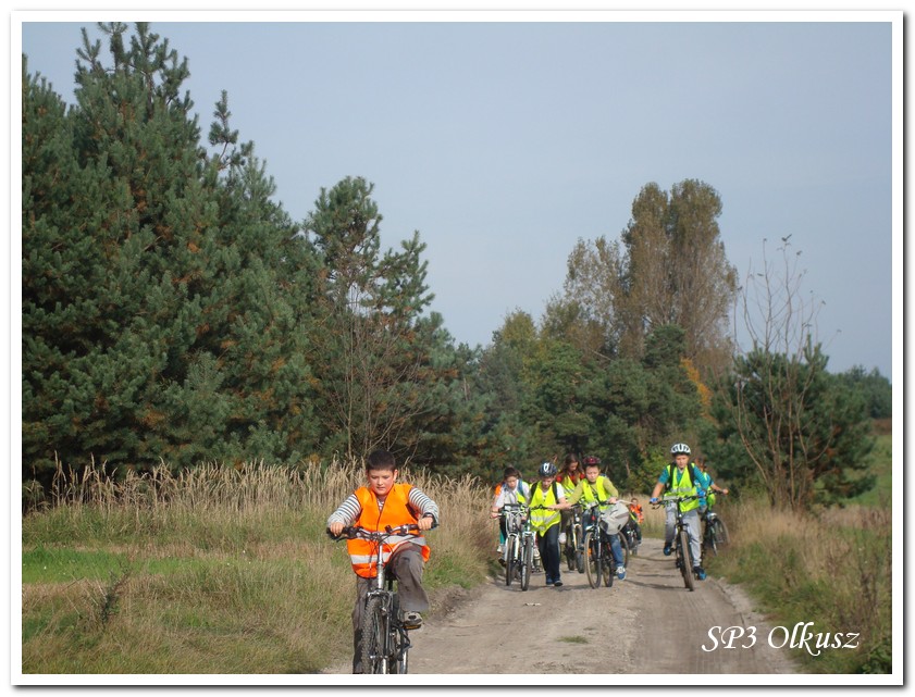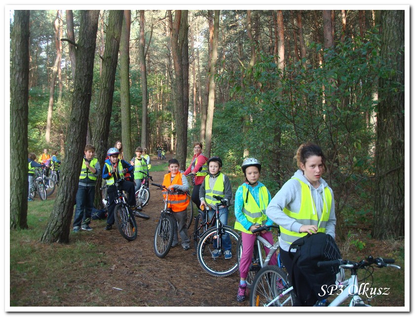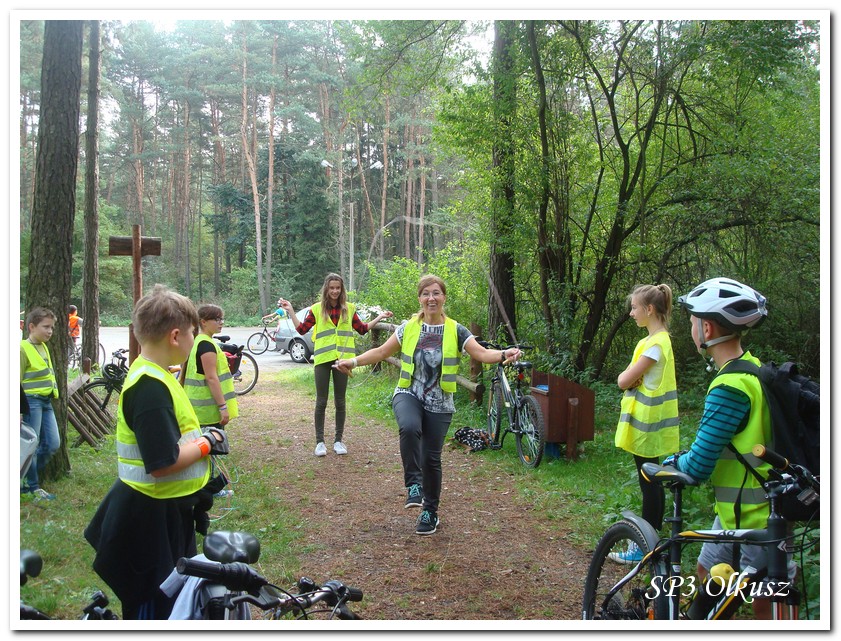 Mimo, że blisko to ciekawie, bo nikt nigdy nie był, nie widział albo był dawno i nie pamięta, a z grupą w sumie przyjemniej niż w mniejszym gronie. Pogoda przepiękna, leśne dróżki w miarę proste, a las jak ze snu. Wymarzona trasa na niedzielne przejażdżki, na które niestety brakuje czasu. Niektóre osoby chcą jechać szybko, ktoś inny zbyt wolno i trzeba czekać. Malownicze widoki lasów mieszanych koją spocone ciała, dają wytchnienie, ale tylko na chwilę. Dalej trzeba jechać. Nikt się nie złości jeśli trzeba zwolnić, zatrzymać się, poczekać. Grupa jest zgrana i odpowiedzialna. Wszyscy mają jeden cel: dojechać szczęśliwie i wrócić. I znów pod górkę, i dalej polaną. Ktoś schodzi z roweru, ktoś inny próbuje swych sił. I dalej przed siebie. Trzeba się poświęcić, a widoki rekompensują każdy wysiłek. Teraz znów równo, polną drogą, na szczęście nie pod górkę, trochę kamieni, piasek utrudnia przejazd, ale solidarnie razem. Ktoś zwolnił... - To ja dotrzymam mu kroku! – Poczekajmy! – słyszały często opiekunki z ust uczestników. Niewątpliwie lekcje wychowawcze o tolerancji, pomaganiu słabszym, nie wyśmiewaniu się, gdy coś komuś nie wychodzi, najwyraźniej przynoszą widoczne efekty w olkuskiej szkole. W tym czasie chwilka dla ducha i ciała na cudnej leśnej polanie. I znowu w drogę. I dalej niestrudzeni rajdowcy pokonywali trasę w kierunku Kogutka. A tam miejsce leśne jak zaczarowane zaprasza na zacienione ławki aby odpocząć. Urokliwe stare drzewa i cudowne liście jesienne pod nimi. Po regeneracyjnym dostarczeniu płynów spragnionym organizmom, dzieci jeszcze relaksowały się w czasie zabaw rekreacyjnych. Gra w piłkę, pokonywanie w sztafecie wyścigu rowerowego w slalomie, w który włączyły się opiekunki, skakanie na skakankach, frisbee na tle przyrody dostarczyły niezwykłych wrażeń i z pewnością zbliżyły do siebie dzieci. Dobra zabawa, salwy śmiechu, piękne widoki – to najczęstsze słowa, które pojawiały się na ustach uczestników Odblaskowego Rajdu Rowerowego, który dzieci nazwały Rajdem „Oskarowym" ze względu na wydarzenia mu towarzyszące. Trasa powrotna prowadziła ponownie przez Zimnodół, gdyż wspaniała Rodzina Państwa Sygułów zaprosiła wszystkich uczestników rajdu na pieczenie kiełbasek oraz niebywale przepyszne łakocie w postaci wspaniałych wypieków, którymi zarówno dzieci jak i ich opiekunki były zachwycone. Udostępniono toalety w domu, taras i miejsce na łące. Wdzięczności wręcz nie można było wyrazić słowami, bo jeśli wszystkie słowa nie są w stanie wyrazić wdzięczności, jest jedno, krótkie, skromne: DZIĘKUJEMY!!! W doskonałych humorach, z pełnymi brzuszkami i w świetnej kondycji uczestnicy wyjazdu musieli wracać. Zapowiedzieli jednak swoim opiekunkom, że to nie ostatnia ich wyprawa rowerowa!