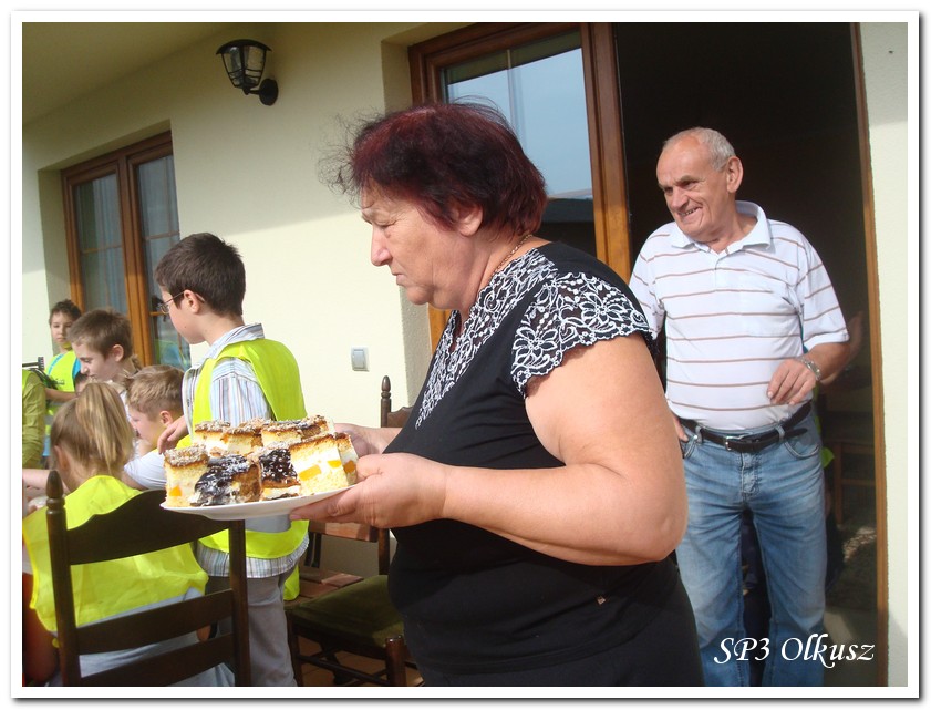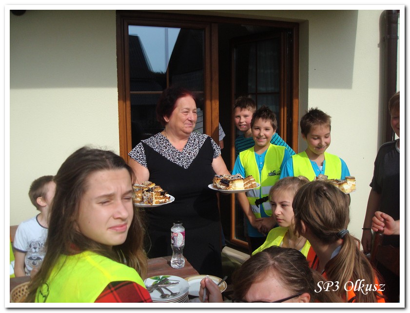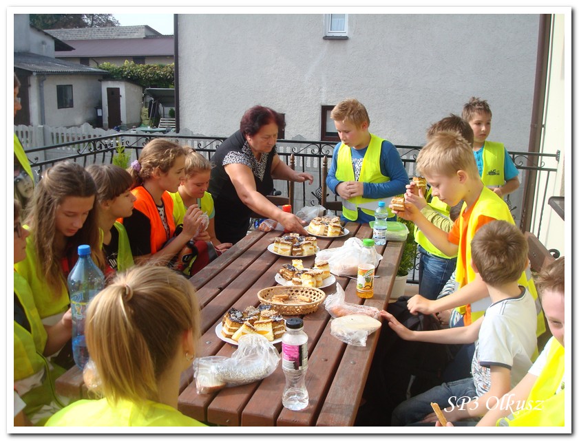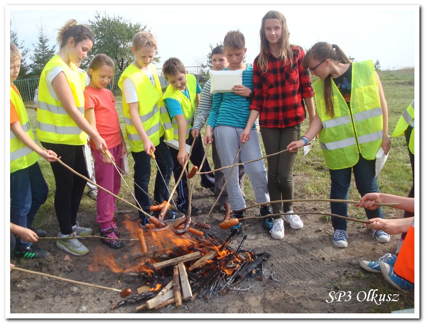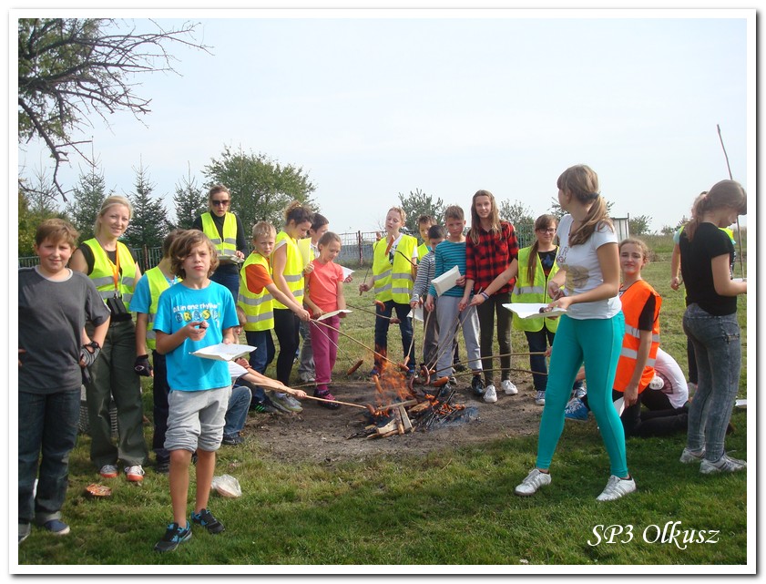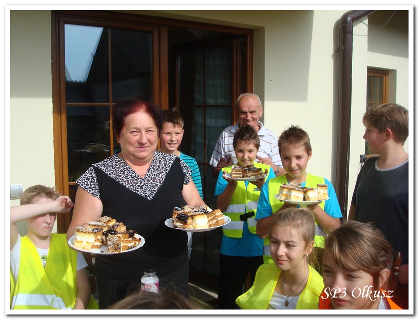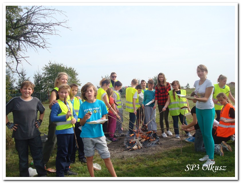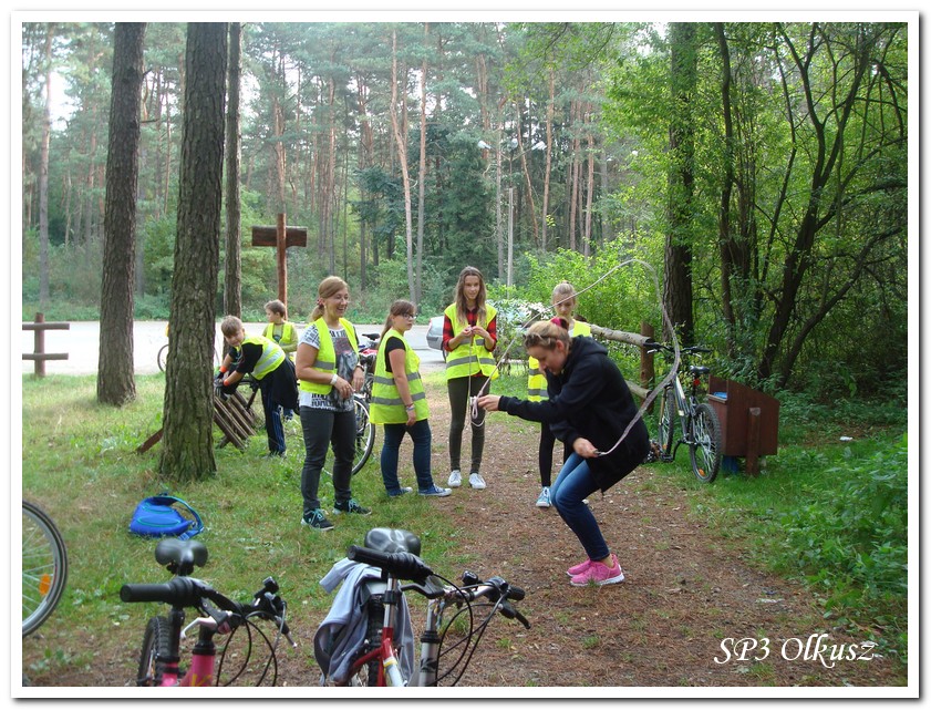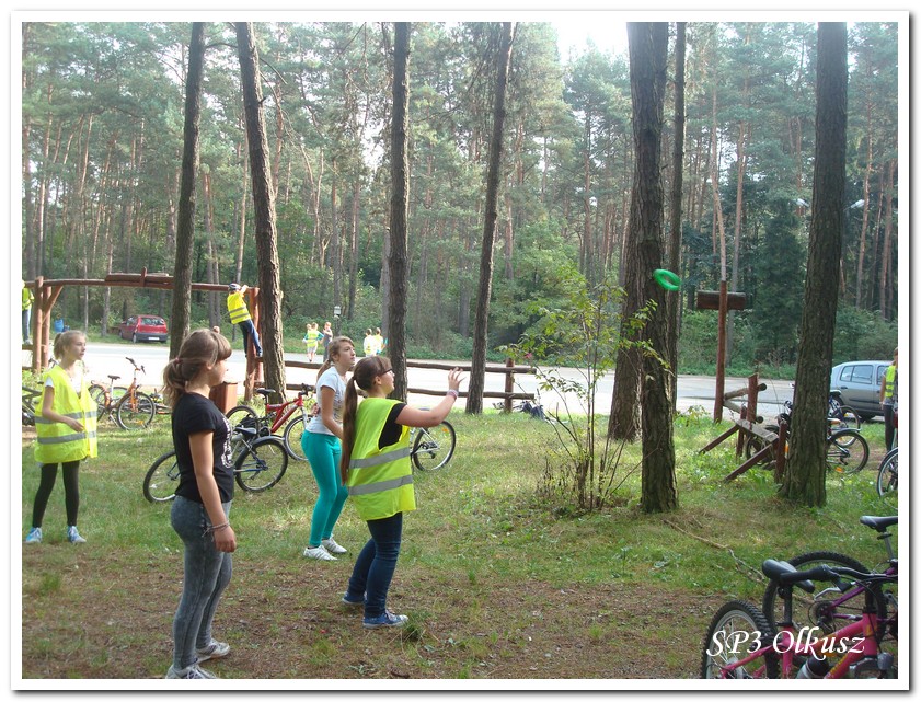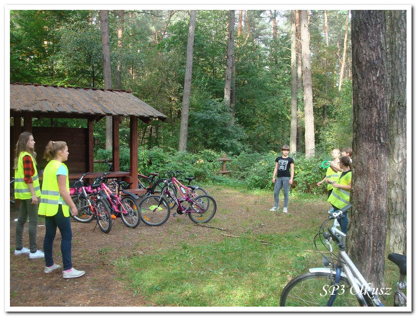 Mimo, że blisko to ciekawie, bo nikt nigdy nie był, nie widział albo był dawno i nie pamięta, a z grupą w sumie przyjemniej niż w mniejszym gronie. Pogoda przepiękna, leśne dróżki w miarę proste, a las jak ze snu. Wymarzona trasa na niedzielne przejażdżki, na które niestety brakuje czasu. Niektóre osoby chcą jechać szybko, ktoś inny zbyt wolno i trzeba czekać. Malownicze widoki lasów mieszanych koją spocone ciała, dają wytchnienie, ale tylko na chwilę. Dalej trzeba jechać. Nikt się nie złości jeśli trzeba zwolnić, zatrzymać się, poczekać. Grupa jest zgrana i odpowiedzialna. Wszyscy mają jeden cel: dojechać szczęśliwie i wrócić. I znów pod górkę, i dalej polaną. Ktoś schodzi z roweru, ktoś inny próbuje swych sił. I dalej przed siebie. Trzeba się poświęcić, a widoki rekompensują każdy wysiłek. Teraz znów równo, polną drogą, na szczęście nie pod górkę, trochę kamieni, piasek utrudnia przejazd, ale solidarnie razem. Ktoś zwolnił... - To ja dotrzymam mu kroku! – Poczekajmy! – słyszały często opiekunki z ust uczestników. Niewątpliwie lekcje wychowawcze o tolerancji, pomaganiu słabszym, nie wyśmiewaniu się, gdy coś komuś nie wychodzi, najwyraźniej przynoszą widoczne efekty w olkuskiej szkole. W tym czasie chwilka dla ducha i ciała na cudnej leśnej polanie. I znowu w drogę. I dalej niestrudzeni rajdowcy pokonywali trasę w kierunku Kogutka. A tam miejsce leśne jak zaczarowane zaprasza na zacienione ławki aby odpocząć. Urokliwe stare drzewa i cudowne liście jesienne pod nimi. Po regeneracyjnym dostarczeniu płynów spragnionym organizmom, dzieci jeszcze relaksowały się w czasie zabaw rekreacyjnych. Gra w piłkę, pokonywanie w sztafecie wyścigu rowerowego w slalomie, w który włączyły się opiekunki, skakanie na skakankach, frisbee na tle przyrody dostarczyły niezwykłych wrażeń i z pewnością zbliżyły do siebie dzieci. Dobra zabawa, salwy śmiechu, piękne widoki – to najczęstsze słowa, które pojawiały się na ustach uczestników Odblaskowego Rajdu Rowerowego, który dzieci nazwały Rajdem „Oskarowym" ze względu na wydarzenia mu towarzyszące. Trasa powrotna prowadziła ponownie przez Zimnodół, gdyż wspaniała Rodzina Państwa Sygułów zaprosiła wszystkich uczestników rajdu na pieczenie kiełbasek oraz niebywale przepyszne łakocie w postaci wspaniałych wypieków, którymi zarówno dzieci jak i ich opiekunki były zachwycone. Udostępniono toalety w domu, taras i miejsce na łące. Wdzięczności wręcz nie można było wyrazić słowami, bo jeśli wszystkie słowa nie są w stanie wyrazić wdzięczności, jest jedno, krótkie, skromne: DZIĘKUJEMY!!! W doskonałych humorach, z pełnymi brzuszkami i w świetnej kondycji uczestnicy wyjazdu musieli wracać. Zapowiedzieli jednak swoim opiekunkom, że to nie ostatnia ich wyprawa rowerowa!