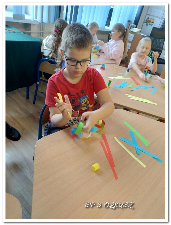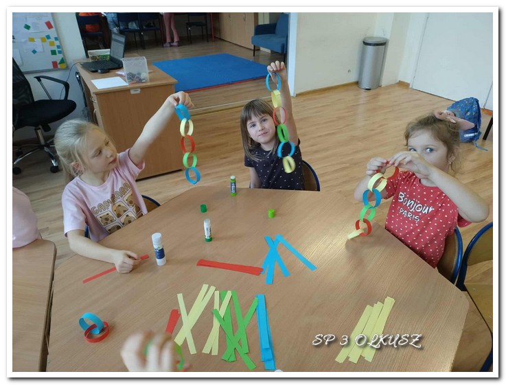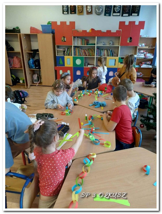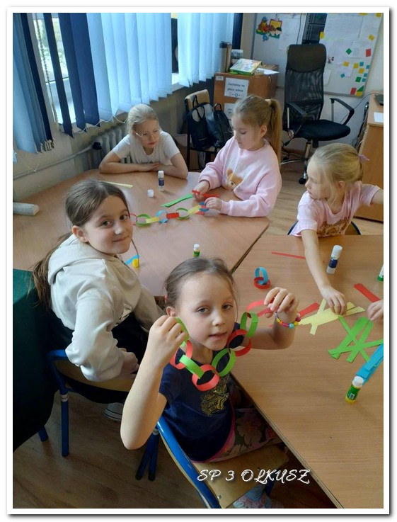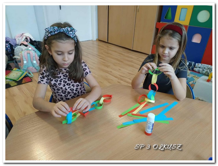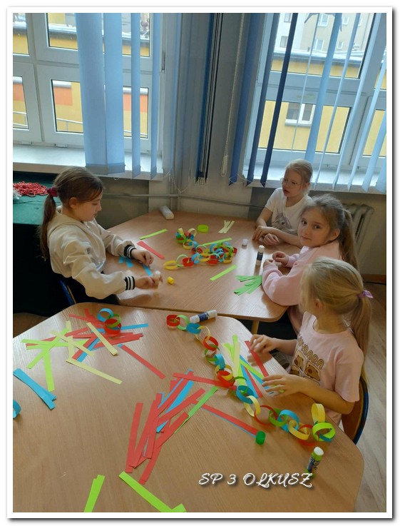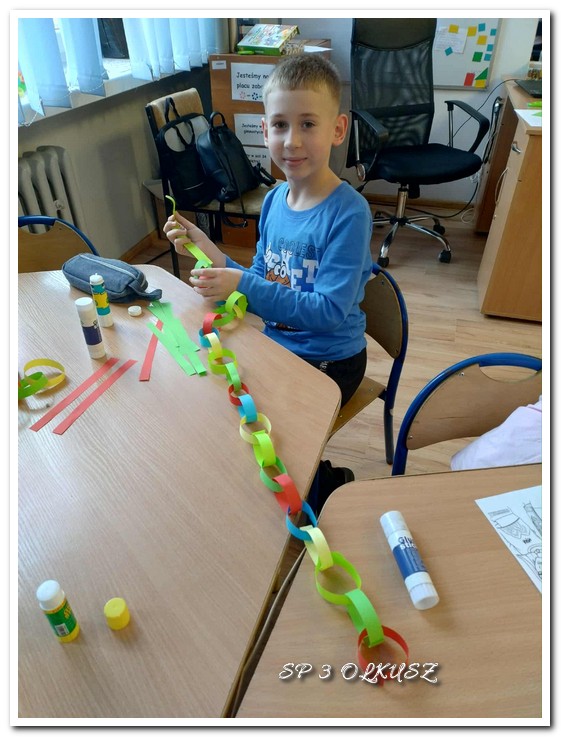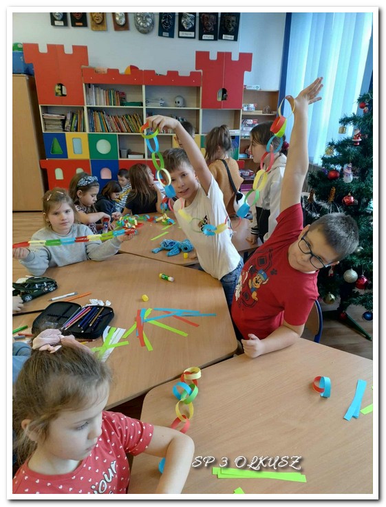 Podczas dzisiejszych zajęć nasze Świetliczaki wykonywały świąteczną ozdobę - łańcuch z kolorowego papieru na choinkę. Na początku omówiliśmy potrzebne materiały do pracy: kolory papier, klej, nożyczki, a także sposób łączenia papierowych pasków, tak aby stworzyć długi, wytrzymały łańcuch. Dzieci samodzielnie wycinały paski, wybierały kolory tworząc pierwsze ogniwa łańcucha. Następnie łączyły kolejne elementy ćwicząc przy tym precyzję i koordynacje ruchowa. W trakcie pracy panowała miła, przedświąteczna atmosfera - dzieci chętnie pomagały sobie nawzajem oraz wymieniały pomysły na kompozycje kolorystyczne. Zajęcie zakończyły się wspólnym podziwianiem efektów. Powstały długie, kolorowe łańcuchy, które zostały wykorzystane do udekorowania choinki w świetlicy. Dzieci były zaangażowane i zadowolone z wykonanej pracy.