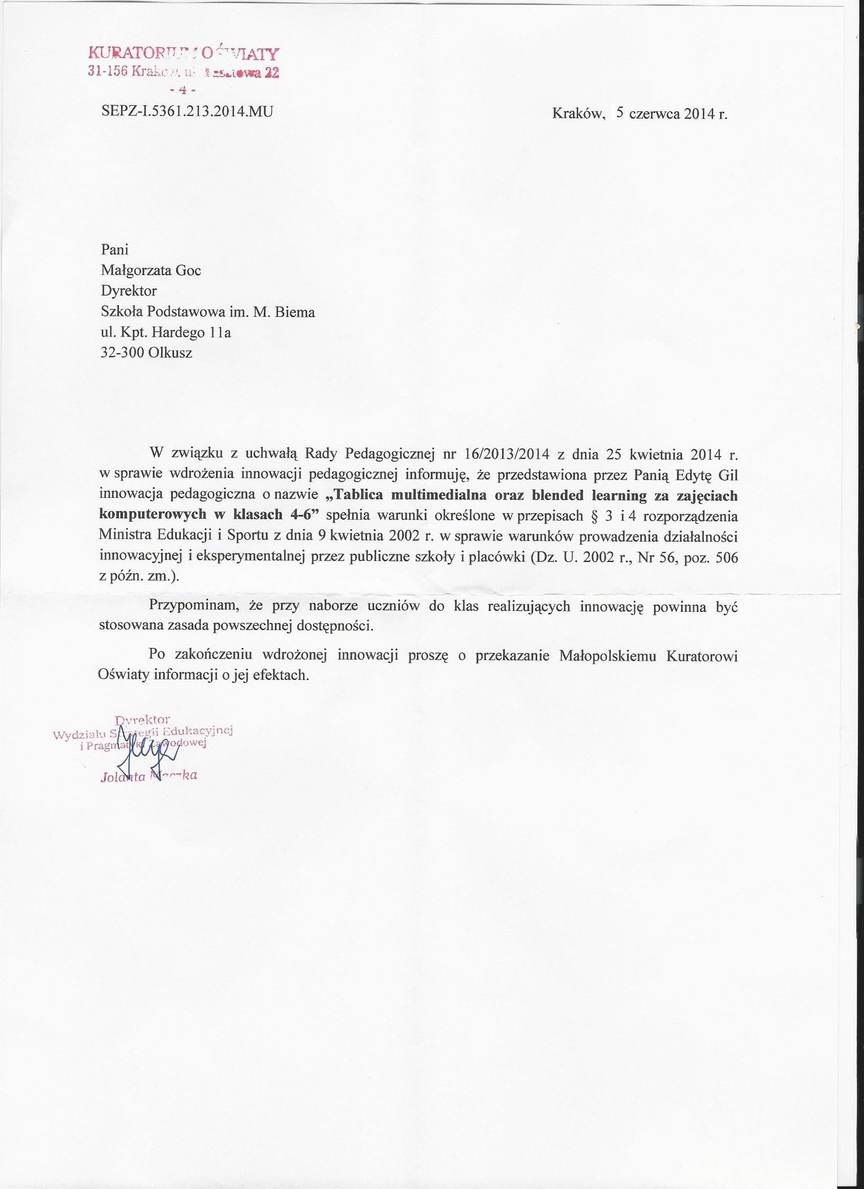 Informujemy o zatwierdzeniu przez Małopolskiego Kuratora Oświaty kolejnej innowacji pedagogicznej o nazwie "Tablica multimedialna oraz blended learning na zajęciach komputerowych w klasa 4-6" opracowaną przez mgr Edytę Gil - nauczycielkę zajęć komputerowych.