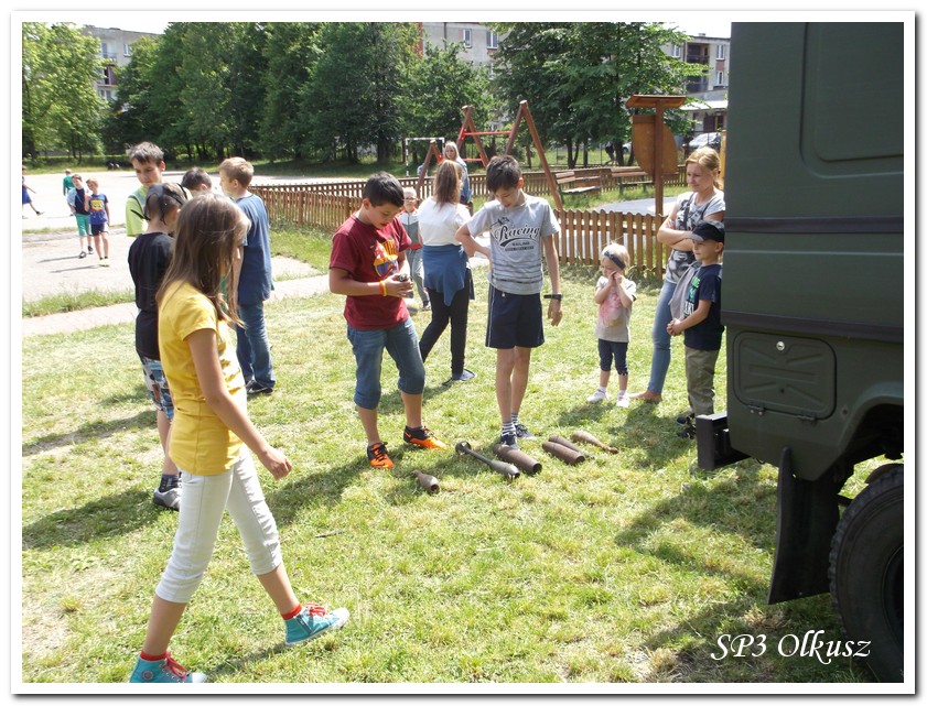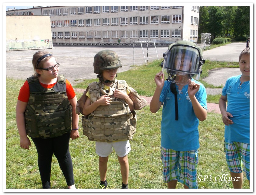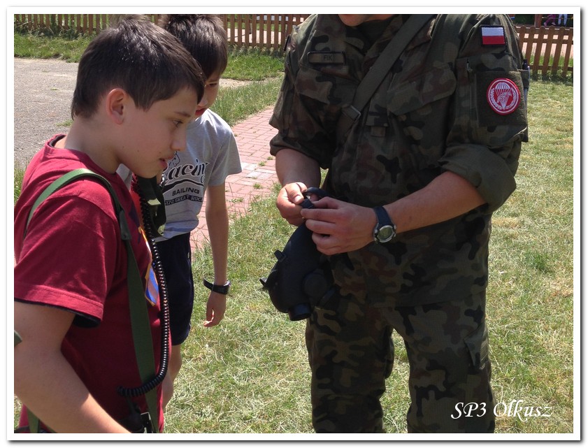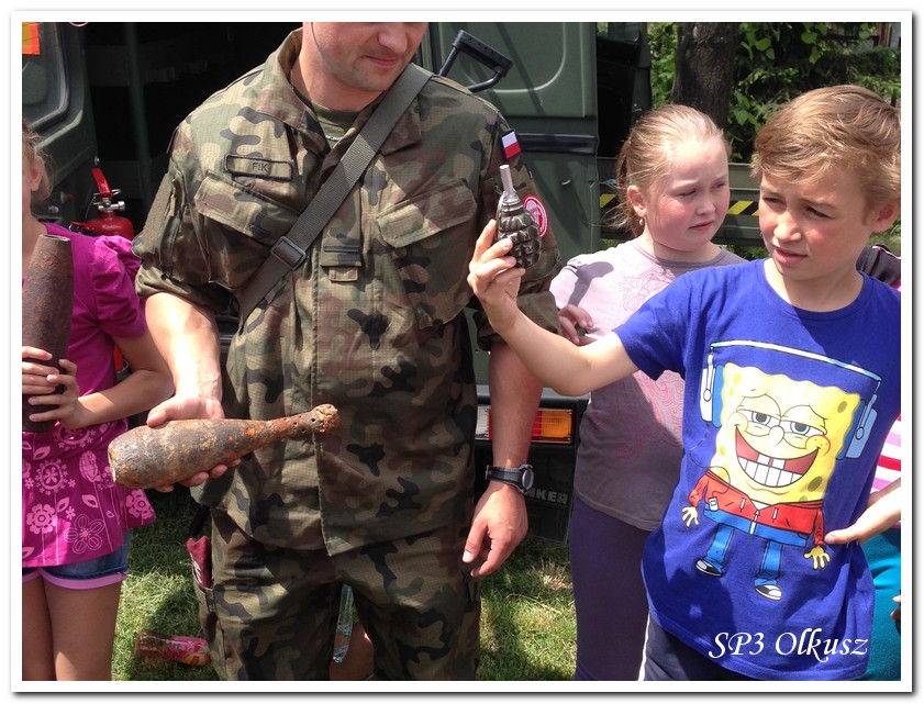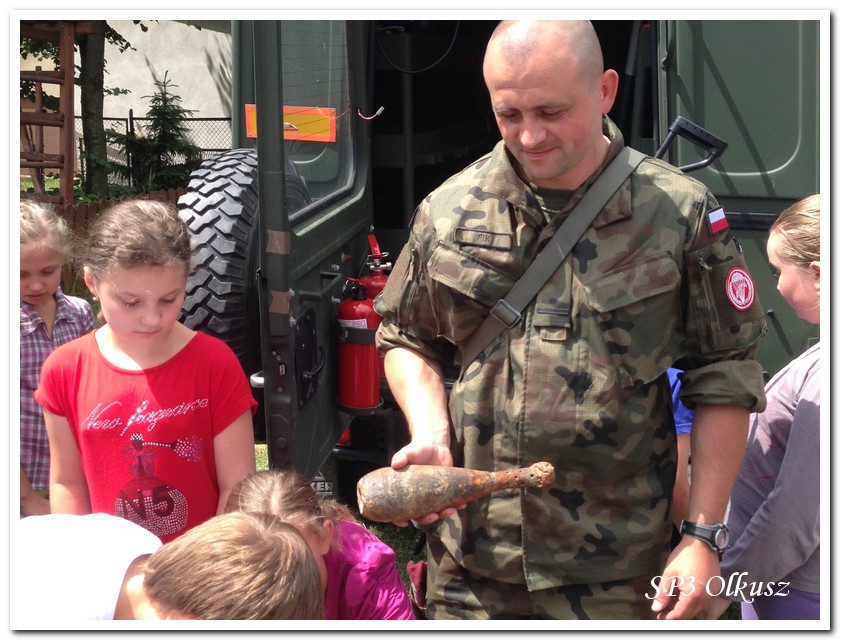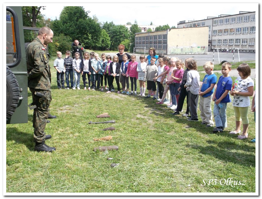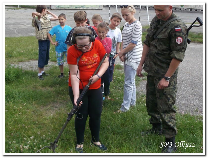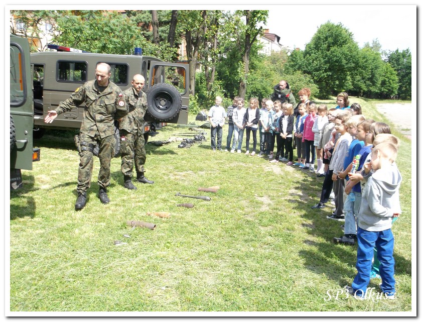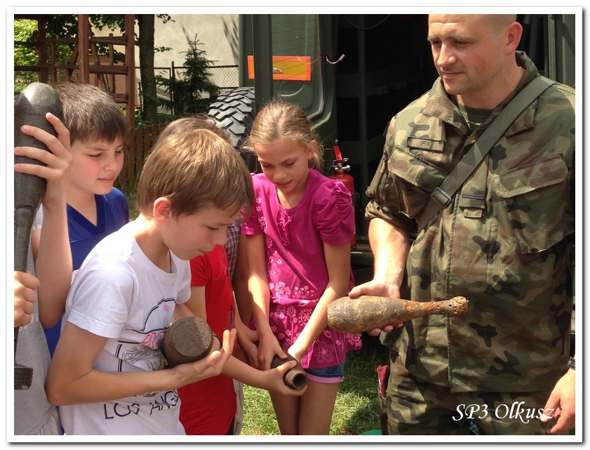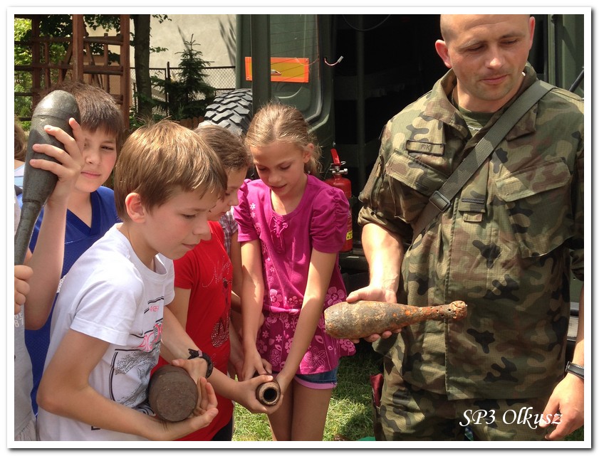 Plutonowy Robert Poterek, starszy szeregowy Paweł Fik i starszy szeregowy Piotr Filicka przeprowadzili lekcje dydaktyczną na temat: Zagrożenia w terenie. W czasie spotkania nasi uczniowie mogli zobaczyć i dotknąć różnych typów uzbrojenia, w tym broni strzeleckiej, granatów i pocisków artyleryjskich. Niektórzy z nich mogli założyć na siebie elementy wyposażenia sapera tj. mundur, specjalny kombinezon, maskę, hełm itp. Dzieci mogły także m.in. podjąć praktyczne próby poszukiwania w terenie za pomocą wykrywacza min W3PB. Poza tym zobaczyły specjalny pojazd do przewozu niewybuchów.