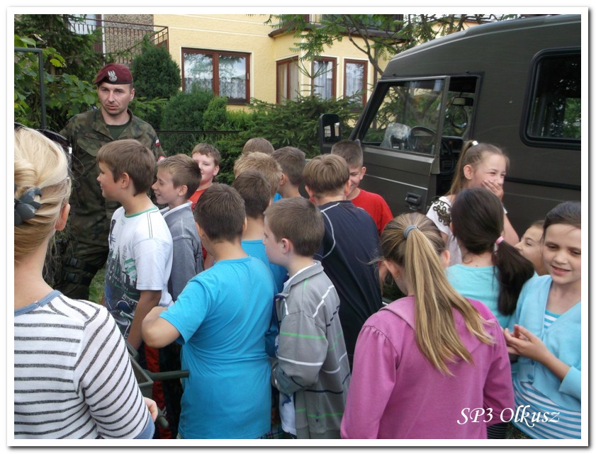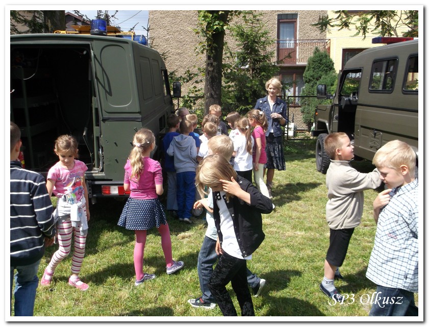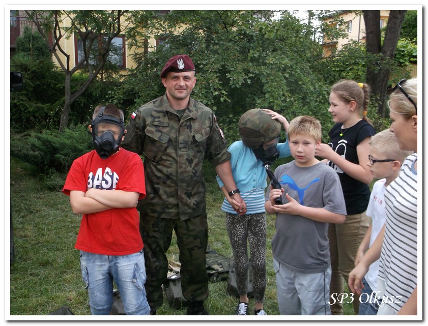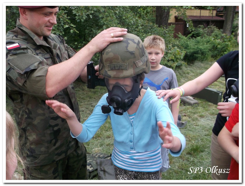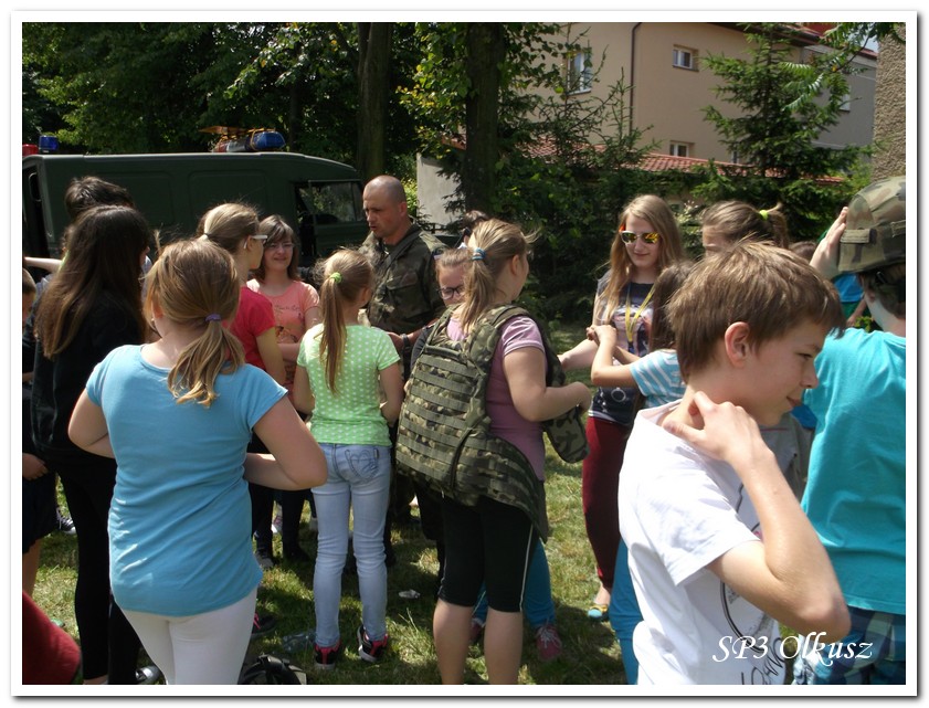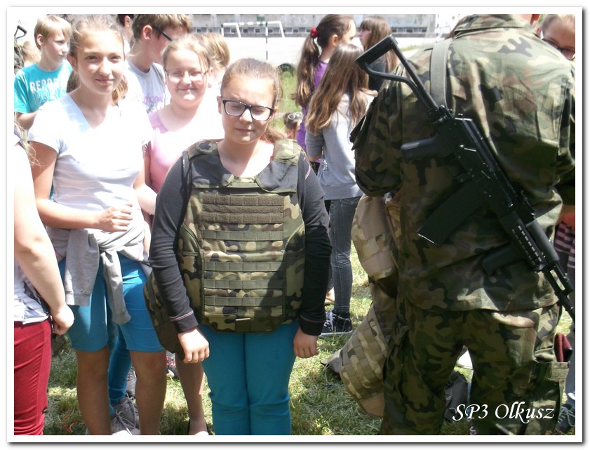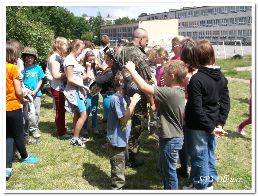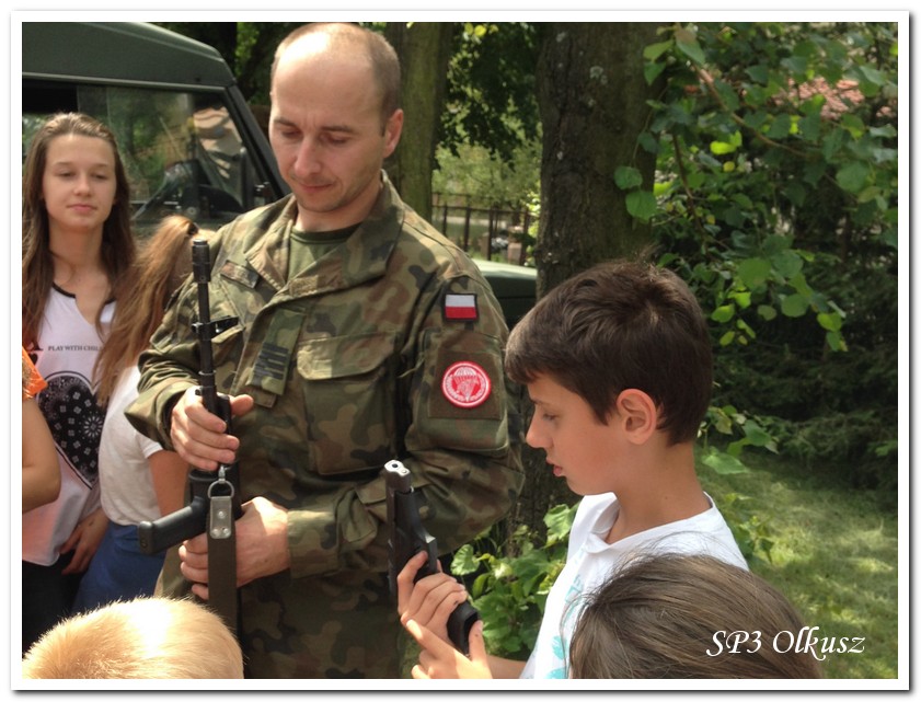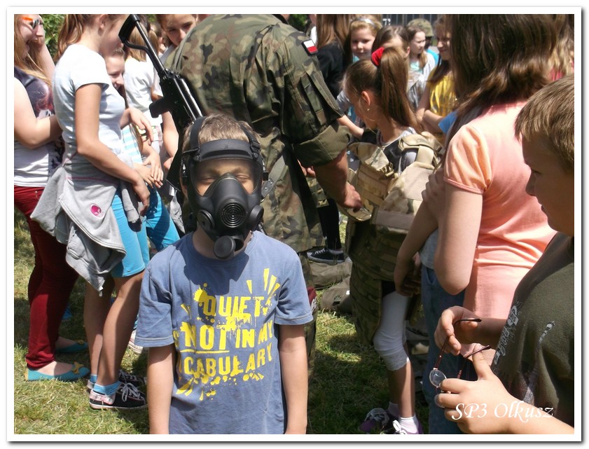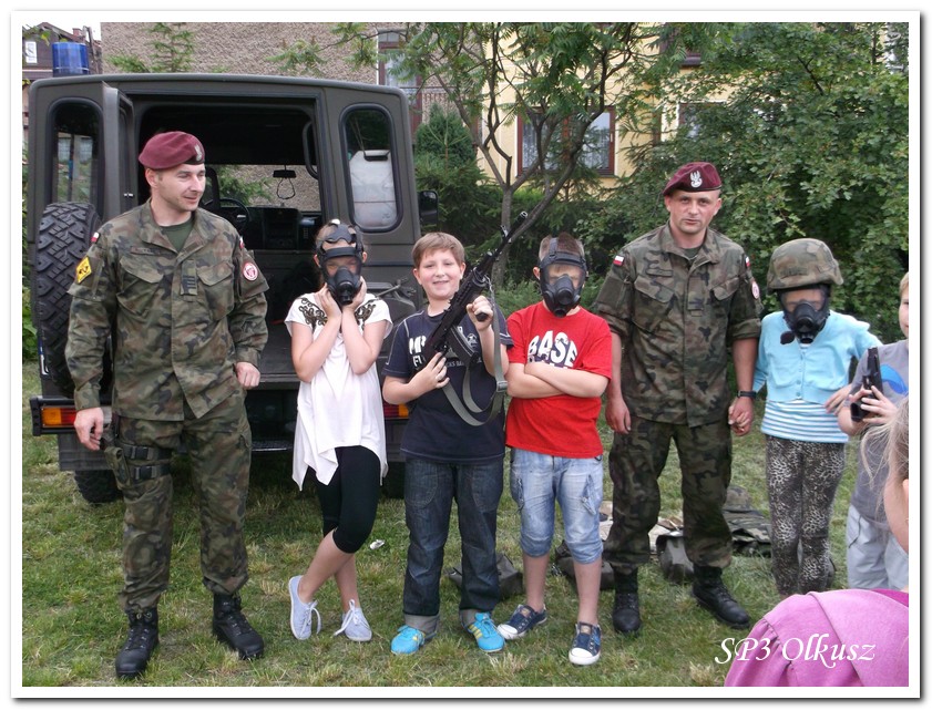 Plutonowy Robert Poterek, starszy szeregowy Paweł Fik i starszy szeregowy Piotr Filicka przeprowadzili lekcje dydaktyczną na temat: Zagrożenia w terenie. W czasie spotkania nasi uczniowie mogli zobaczyć i dotknąć różnych typów uzbrojenia, w tym broni strzeleckiej, granatów i pocisków artyleryjskich. Niektórzy z nich mogli założyć na siebie elementy wyposażenia sapera tj. mundur, specjalny kombinezon, maskę, hełm itp. Dzieci mogły także m.in. podjąć praktyczne próby poszukiwania w terenie za pomocą wykrywacza min W3PB. Poza tym zobaczyły specjalny pojazd do przewozu niewybuchów.