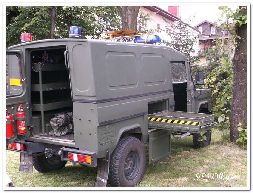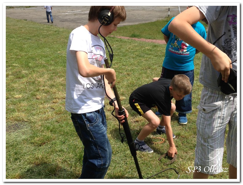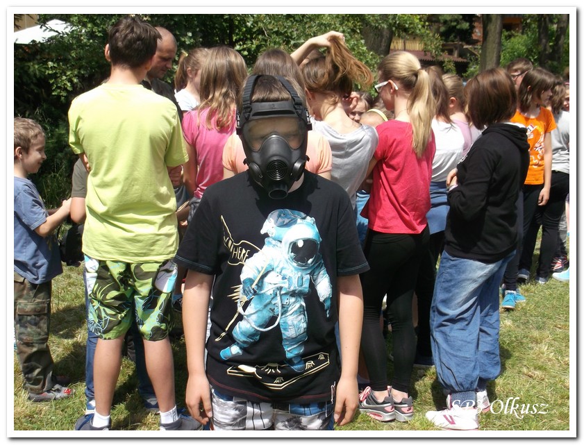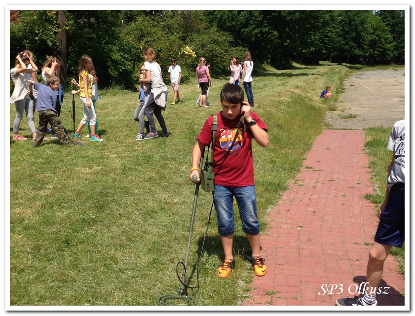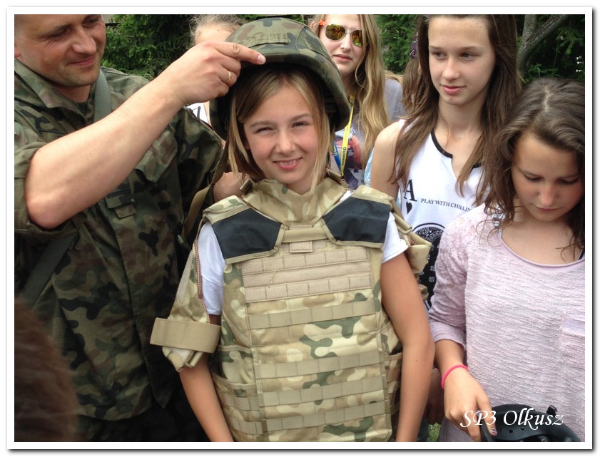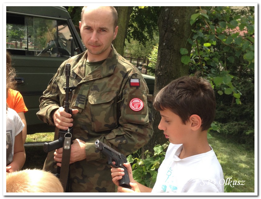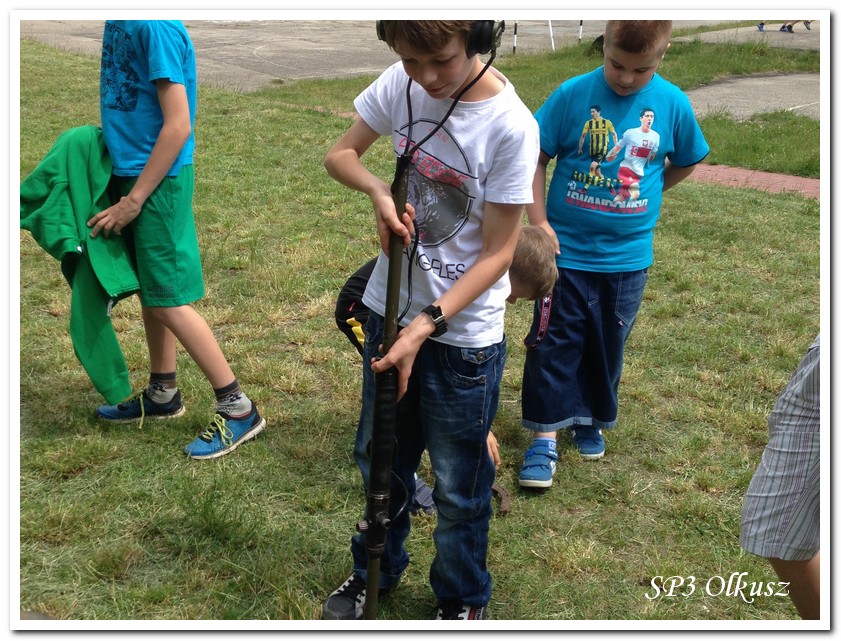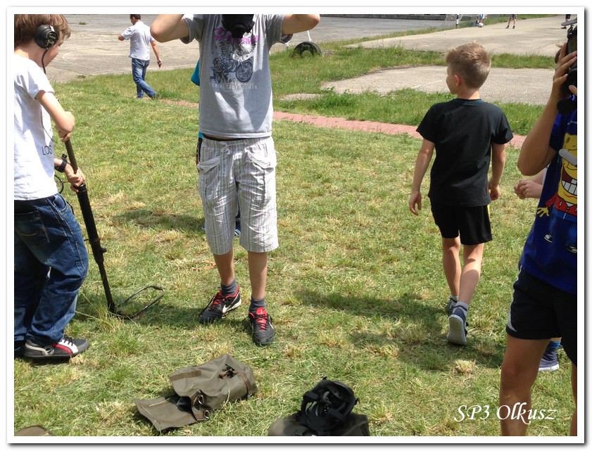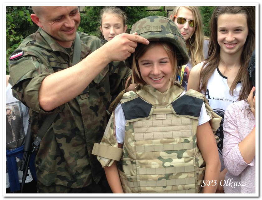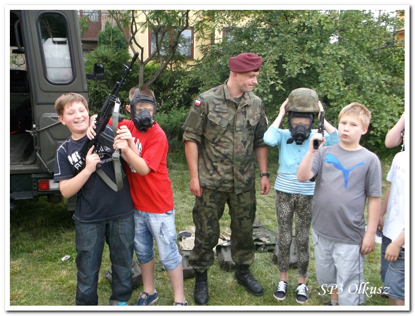 Plutonowy Robert Poterek, starszy szeregowy Paweł Fik i starszy szeregowy Piotr Filicka przeprowadzili lekcje dydaktyczną na temat: Zagrożenia w terenie. W czasie spotkania nasi uczniowie mogli zobaczyć i dotknąć różnych typów uzbrojenia, w tym broni strzeleckiej, granatów i pocisków artyleryjskich. Niektórzy z nich mogli założyć na siebie elementy wyposażenia sapera tj. mundur, specjalny kombinezon, maskę, hełm itp. Dzieci mogły także m.in. podjąć praktyczne próby poszukiwania w terenie za pomocą wykrywacza min W3PB. Poza tym zobaczyły specjalny pojazd do przewozu niewybuchów.