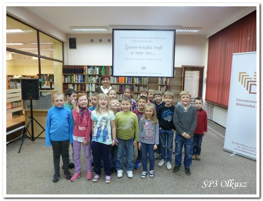 13 maja 2014 r. uczniowie klasy 1a kolejny raz uczestniczyły w lekcji bibliotecznej w PiMBP w Olkuszu. Podczas zajęć dzieci dowiedziały się jak powstaje książka i jaka jest droga książki od pisarza do czytelnika. Od dziś już wiedzą, kim jest i czym zajmuje się: twórca, wydawca, redaktor, grafik, ilustrator, co dzieje się w drukarni, introligatorni, gdzie książki się kupuje, a gdzie wypożycza.
