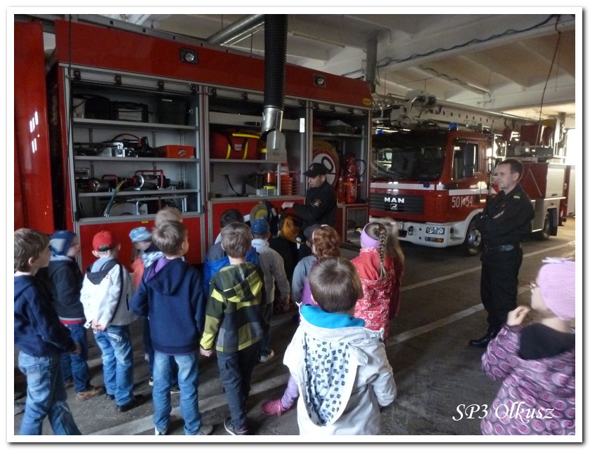 W ramach akcji „Dni ochrony przeciwpożarowej – otwarte strażnice" 13 maja 2014 r. pierwszaki odwiedziły Jednostkę Straży Pożarnej w Olkuszu. Dzieci z zainteresowaniem słuchały o ciężkiej i odpowiedzialnej pracy strażaków, zapoznały się z bogatym sprzętem gaśniczym a wspaniałe czerwone wozy zrobiły na nich ogromne wrażenie.