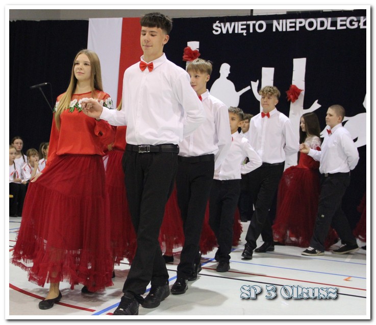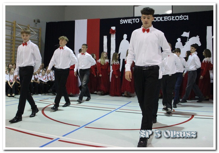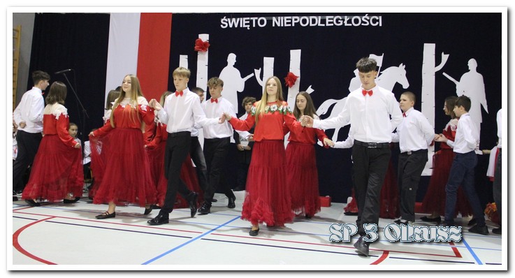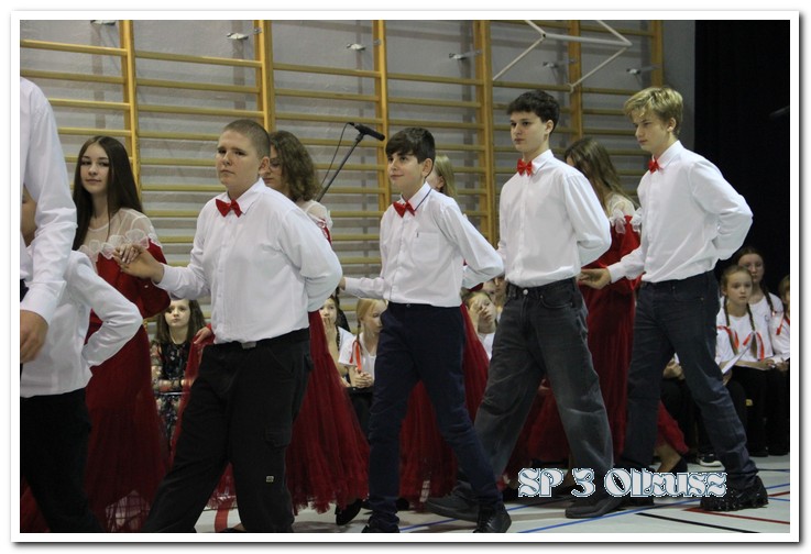 Występy wokalne i instrumentalne wprowadziły wszystkich w podniosły nastrój. Uczniowie zatańczyli krakowiaka, poloneza i walca, prezentując elegancję i zaangażowanie.