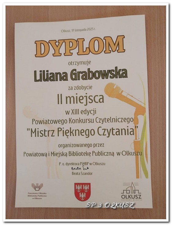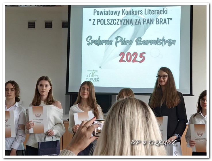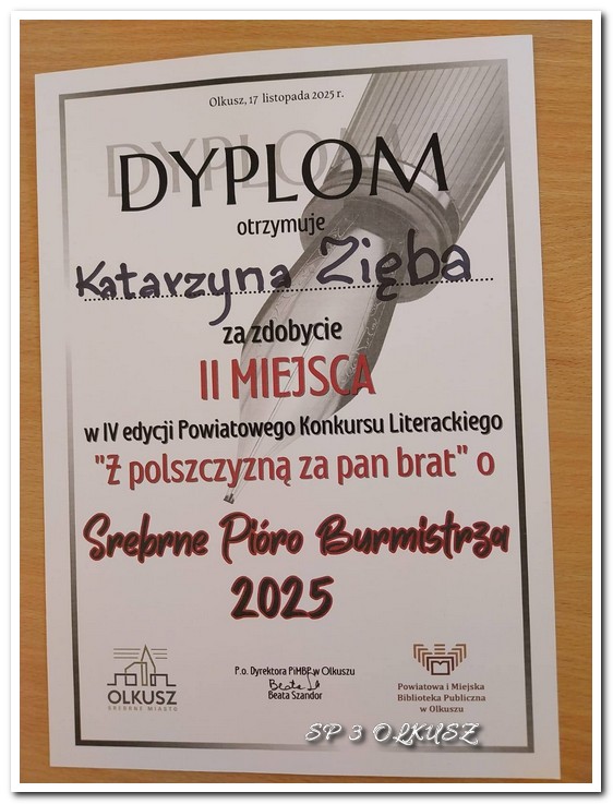 17 listopada 2025 roku w Powiatowej i Miejskiej Bibliotece Publicznej w Olkuszu odbyła się IV edycja Powiatowego Konkursu Literackiego „Z polszczyzną za pan brat" o Srebrne Pióro Burmistrza Miasta i Gminy Olkusz oraz uroczyste wręczenie nagród w XIII Powiatowym Konkursie Czytelniczym ,,Mistrz Pięknego Czytania".IV Powiatowy Konkurs Literacki „Z polszczyzną za pan brat" skierowany był do uczniów klas VI–VIII szkół podstawowych. Projekt objęty został honorowym patronatem przez Burmistrza Miasta i Gminy Olkusz – Pana Romana Piaśnika. Dodatkowo, po raz pierwszy wręczono specjalne Nagrody Burmistrza Miasta i Gminy Olkusz.