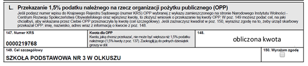 • Kwotę 1,5% podatku, którą chcesz przekazać (pole 148). Kwotę tę należy obliczyć samodzielnie na podstawie swojego podatku.